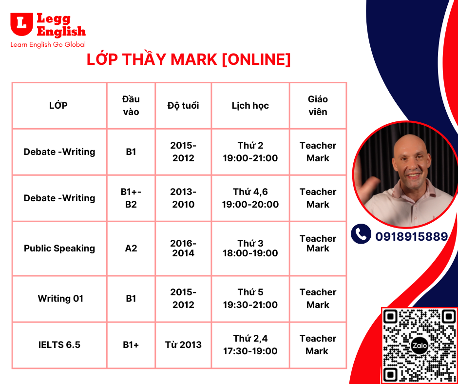 Tại Legg các con không chỉ học Tiếng Anh mà còn phát triển toàn diện từ tâm lí, tư duy logic, tích cách, kĩ năng LeggEnglish khai giảng các khóa học chào Hè với nhiều Ưu Đãi hấp dẫn cho các bố mẹ trên toàn quốc Độ tuổi vàng cho con học Tiếng Anh là từ bao nhiêu tuổi? Tại sao Tiếng Anh lại cực kỳ quan trọng với học sinh cấp 1 Lợi ích của khóa học tiếng Anh thuyết trình tại LEGG ENGLISH Chương trình toàn diện dành cho học sinh (từ 4 đến 18 tuổi) Đăng kí học ngay Chương trình học tập Lớp 1 giáo viên 1 học sinh30 phút Đăng kí học ngay Lớp 1 giáo viên 4 học sinh60 phút Đăng kí học ngay Lớp 1 giáo viên 5 – 7 học sinh60 phút Đăng kí học ngay Chuyên đào tạo giao tiếp, luyện thi và phát triển kỹ năng tiếng Anh toàn diện Thông tin Hotline: 0918 915 889Gmail: legg.edu.vn@gmail.comĐịa chỉ: C07-02 Khu C Geleximco Lê Trọng Tấn, P. Dương Nội, Hà Đông, Hà Nội, Hanoi, Vietnam Fanpage